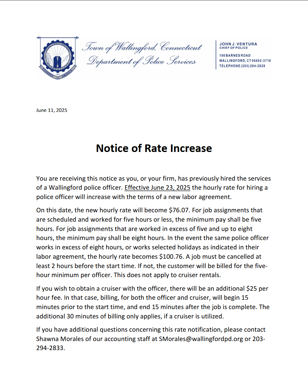 To hire a police officer for an extra duty job, please call (203) 294-2833. The company name, date/time/location of job, number of officers/cruisers, and a contact name/phone number are required to input the assignment.